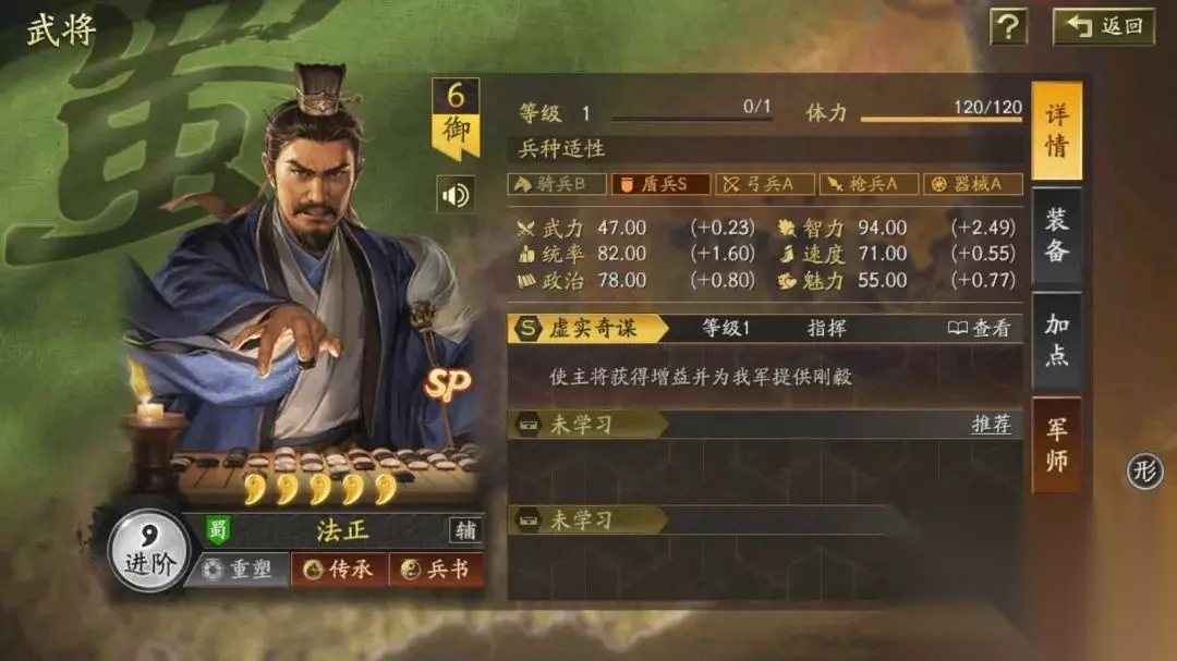 二、武将解读 SP法正面板中的智统成长相较于老法正有了明显提升,具备了一个核心辅助的面板属性基础,兵种适性保持不变。