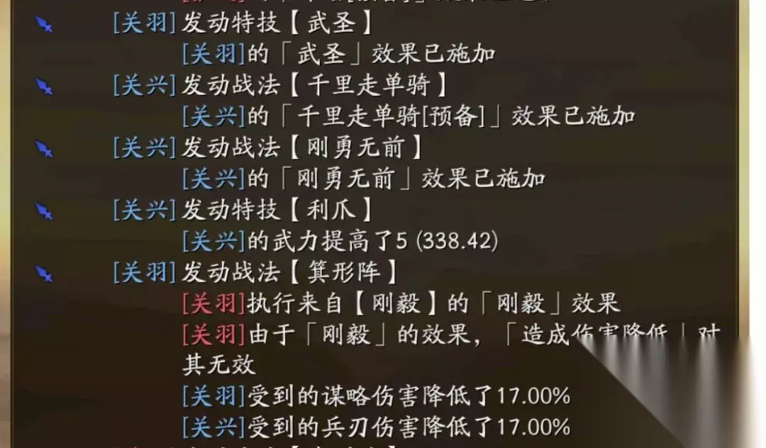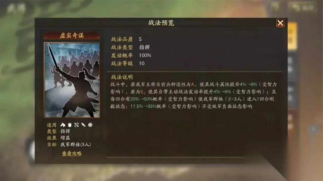 重点来看战法的机制,拆分来看。 ①第一段效果【按兵种】给予不同状态:咱们一般默认为S兵种,8%发动率提升,效果参考荀攸受智力加成后可达到13%左右。这段效果最大利好激活主动战法类的大C位(如:SP关羽、庞统、张角、黄忠)。如果主将是A兵种适性,那相当于省了一个宝物,但浪费了加主动发动率,没必要。同时注意,这个状态增益效果是八回合全程有效!