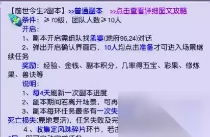 前世今生2副本 属普通副本,3-4天刷新一次 难度对比通天河 *有修炼要求* 具体修炼要求看门派组合 5洞100级推荐10修,法抗5、300血 一组耐卡,加点 天阵下速度比人物高,防御800以上其他全血 带上救人药,一定不要死 新手每个号必带药品 一组2级蓝药、一组金疮药、2个复活药 五龙丹(水清装备也可)