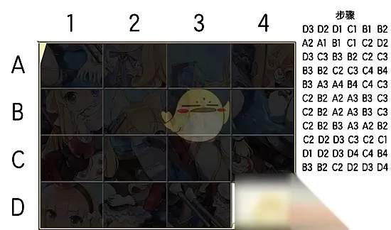 【活动攻略】 上述步骤不是最少步骤,仅供参考 简要步骤文字版: 先拼第一行的前两个放到对应位置,第一行第三个放在1.4位置,1.4放在2.4位置,然后把1.3的移掉,1.3,1.4顺势归为,同理拼掉2.1,3.1,4.1,然后2.2,3.2,4.2,剩下五个随便拼一下可以了 第二种拼图方法:50步法 目前有一个50步走法(来源:碧蓝海事局wiki) D3 C3 C2 D2 D1 C1 C2 D2 D3 D4 C4 B4 A4 A3 A2 B2 B3 C3 C2 C1 B1 A1 A2 B2 B1 C1 D1 D2 D3 D4 C4 C3 C2 B2 B3 B4 C4 C3 D3 D2 C2 C3 B3 A3 A4 B4 B3 C3 D3 D4 按照顺序依次点击即可。 碧蓝航线拼图碎片获取方式一览: 一:完成拼图任务可获取7块碎片 二:通关图示副本可获取拼图碎片,各关卡具体获取拼图碎片的详情如下: 普通2-1副本,四战后出碎片,切记不要先打boss 普通2-3副本,两战后出碎片 普通3-1副本,一战后出碎片 普通3-3副本,小怪全清出碎片 普通3-4副本,进入副本就有 普通4-1副本,全清 普通4-2副本,全清 普通4-4副本,全清