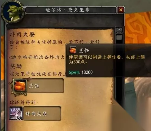 烹饪225级之后学习位置: 1、魔兽世界里玩家烹饪等级到达225后,想要继续升级需要完成提高烹饪等级上限的任务。 2、完成任务需要满足两个条件,人物等级到达25级,烹饪等级到达225级,做任务前还需要提前准备好12个巨蛋,10个美味的蚌肉,20个奥特兰克冷酪。