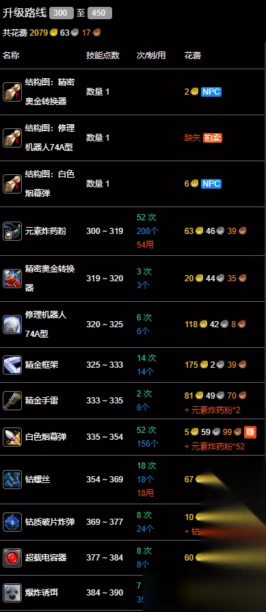 【全专业冲级攻略汇总】 wlk工程300-450冲级攻略 数据以一区 辛洛斯部落为例,其他区服请参考:WLK专业技能冲级宝典 300~319:元素炸药粉