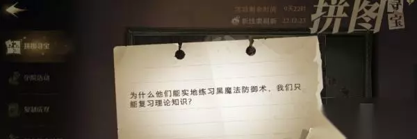为什么他们能实地练习黑魔法防御术,我们只能复习理论知识是今天的拼图线索,根据线索的黑魔法小编猜测今天的拼图位置在黑魔法课教室,那么具体的怎么完成呢,和小编一起来…