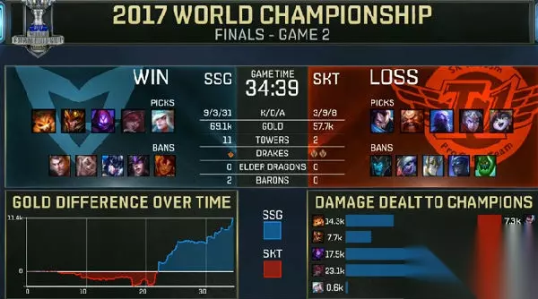 【赛局点评】 SSG选用出与第一局相似的阵容,而SKT选择瑞兹加上亚索的中上组合。比赛开始,SKT很好的针对了SSG打野皇子,持续给予SSG上半部野区压力,发育起来的瑞兹疯狂带节奏,上中取得了巨大的优势,让SKT取得了比赛前期的节奏领先。 比赛进入中期,SKT很好的把握进攻节奏,持续压制SSG的中野。但是比赛进行到19分钟,SKT沟通出现重大失误,双C的选择出现分歧导致被击杀,随后又是在小龙处,SKT拿下土龙后想要先手开团,反被SSG完美配合打出1换5,SSG拿下第一条大龙,开始反攻节奏。 SSG快速的拿资源,并在中路利用纳尔追击酒桶将其打残后,SSG再度拿下大龙,取得胜势。SSG转向分带,完全没有再给SKT任何机会,最终,SSG再度推掉了SKT的基地,赢得赛点! 【赛后数据】