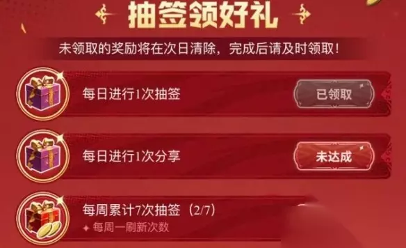 2、每次完成抽签或者分享,都会获得对应的礼包,如果未领取则第二天无法补领;