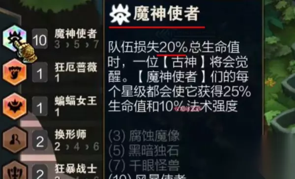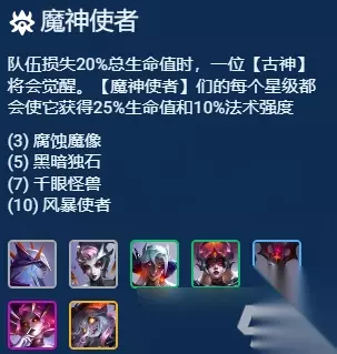魔神使者羁绊介绍: 队伍损失20%总生命值时,一位【古神】将会觉醒。【魔神使者】们的每个星级都会使它获得25%生命值和10%法术强度 (3) 腐蚀魔像 (5) 黑暗独石 (7) 千眼怪兽 (10) 风暴使者
