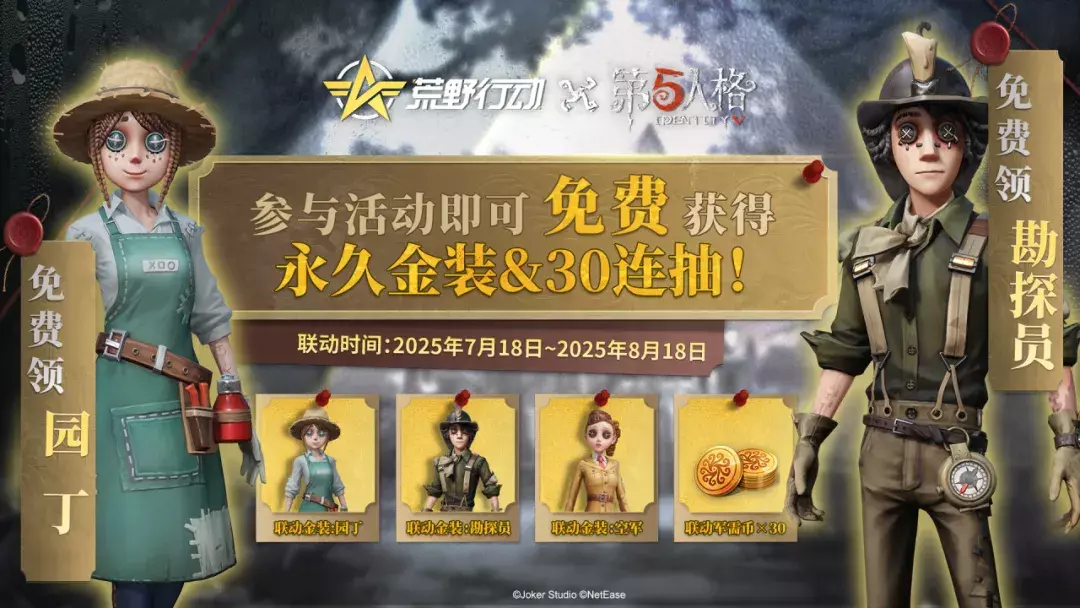 荒野行动 × 第五人格联动返场将于7月18日0点开启!完成联动任务免费领联动金品时装【空军】、【园丁】、【勘探员】和联动军需30连抽。