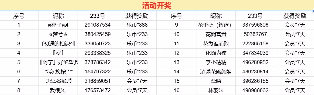 随机抽取10位冒险家获得233会员*7天