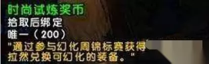 魔兽世界时尚试炼奖币怎么获得 获得方法: 时尚试炼奖币通过参加时尚试炼活动获得,时尚试炼是一个装扮类活动,玩家在活动期间前往各大主城的幻化师对话后就可以参加,每一次都有六名玩家参与竞争,玩家要在准备时间内根据给出的主题搭配自己身上的装备幻化,尽可能的做出一套符合主题的装扮。