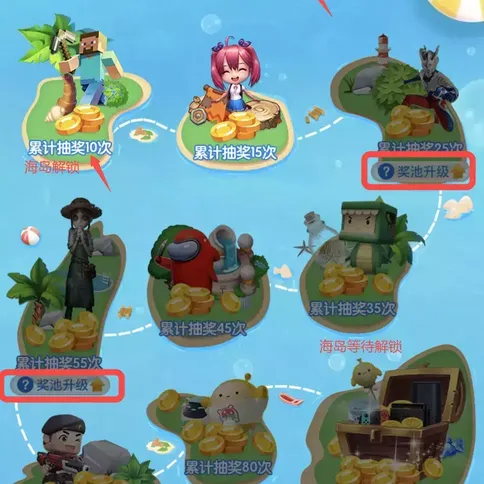 【达成指定累计抽奖次数】抽奖奖池达成下表所示的累计抽奖池次数,完成海岛的解锁,同时可获得对应奖励