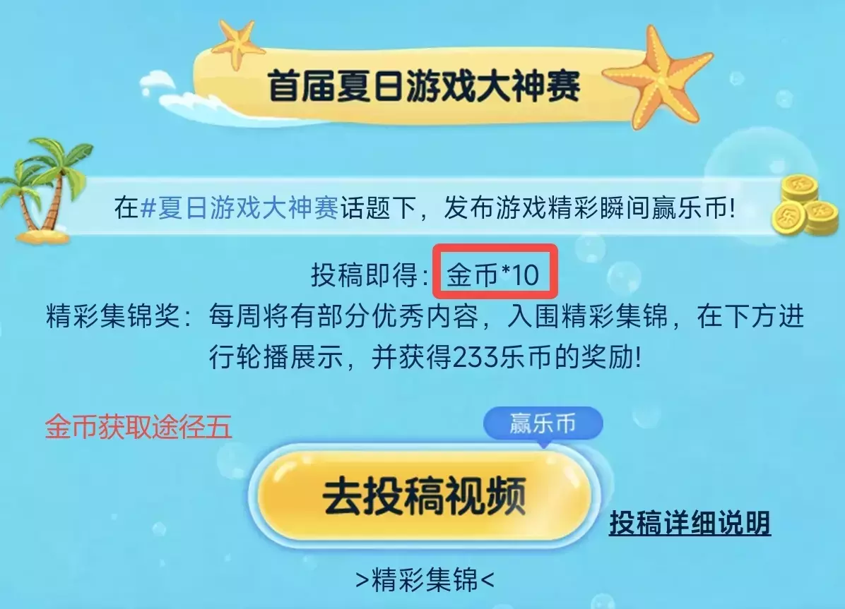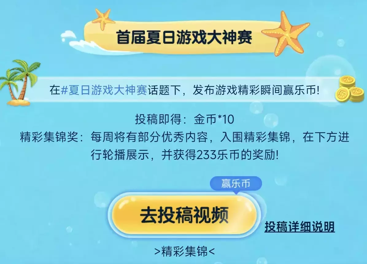 参与方式:在指定的#夏日游戏大神赛 话题下发布个人的精彩游戏瞬间!完成投稿即可获10金币!
