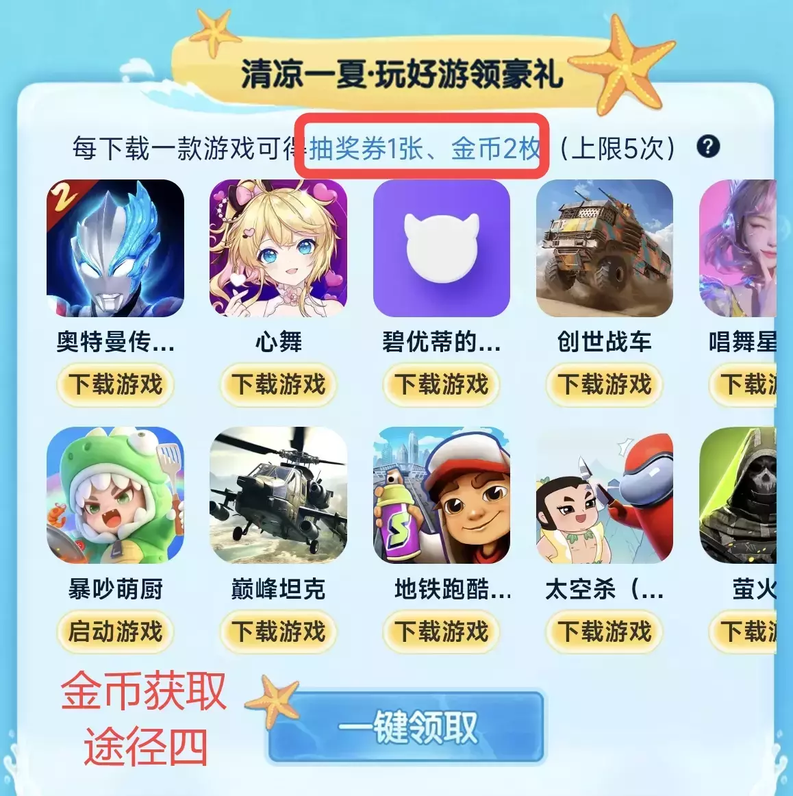 【清凉一夏·玩好游领豪礼】模块,夏日奇遇季重磅推出游戏合集,通过本活动每完成一款游戏的下载,即可获得抽奖券*1+金币*2,一共可获取五次该奖励呦