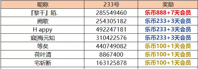 随机抽取3名生存者,送出233乐币+3天会员
