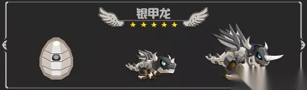 银甲龙 ★★★★★ 天赋技能:『机械切割』 龙之契约:『链锁钢弹』 专属纹章:『狄奥尼索斯之刃』 纹章效果:当银甲龙的血量低于50%的时候,自动进入金甲护体状态,自动抵挡80%的伤害。 有效宝石天赋属性:天赋伤害,天赋范围
