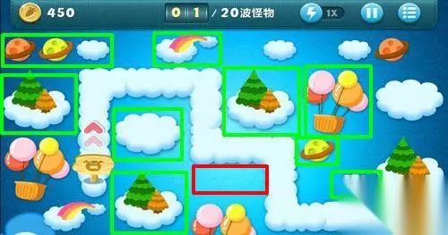 是否有BOSS:有 本关怪物波数:25 本关可建造炮塔:瓶子 天际第10关开局有450金钱,首先 在红色方框内建造2个瓶子炮塔,升为顶级;在第1-19波怪中摧毁所有绿色方框内的 障碍物,有一定的几率获得其它类型的炮塔。