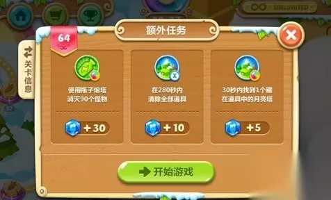 保卫萝卜2第64关水晶萝卜额外任务介绍,本关想要获得水晶萝卜需要分别完成以下3个任务,它们分别是使用瓶子消灭90个怪物、在280秒内清除全部道具和30秒内找到一…