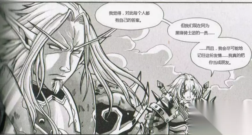 库尔迪拉: 听我说,我在安欧恩神殿陷落之后就一直在跟踪你……观察你,我知道你的名字叫萨萨里安。你先前可以在神殿那里就杀了我弟弟,而且我也相信你差点就杀了他,但是有些在你内心里的事物让你犹豫了,有一部分的你压抑住了这个行为,因此我相信你的灵魂还是活在你的身体……不断地在呼喊和挣扎来抵抗你的主人强迫你所做的行为。从他的影响中解放吧,萨萨里安,加入我们,然后跟着我一起战斗,为了你过去的记忆而战,为了那个藏在内心深处的记忆,当个正义而又真诚的人。 萨萨里安: 你根本不了解我的内心是什么,精灵。不过我……会让你离开,而不是在今晚把你解决掉。但是请记住:下一次我们再见面时,我会杀了你。 库尔迪拉: 随你的便了,就让强者获得胜利吧。 库尔迪拉这份真诚的对话虽然未能够撼动萨萨里安的内心,却还是给了这位死亡骑士一些改变,这让萨萨里安意识到原来自己即使已经死了,也是一样有人认同自己,也是一样有人可以和自己交朋友——即使是敌对的朋友。 接下来随着天灾军团的攻击,高等精灵王国奎尔萨拉斯也逃不过灭亡的命运。萨萨里安和库尔迪拉也进行了最后的决斗,但是直接进行面对面的剑术战斗并不是游侠所擅长的森林躲藏战,库尔迪拉被击败。他请求萨萨里安给他一个痛快,这次萨萨里安没有再犹豫,把剑刺入了库尔迪拉的胸膛。