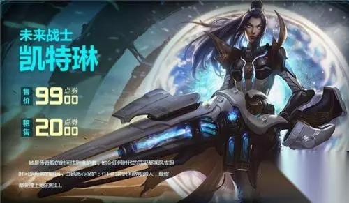 LOL未来战士凯特琳介绍: 她是传奇般的时间法则维护者,她令任何时代的罪犯都闻风丧胆时间是脆弱的谜团,由她悉心保护;任何打破时间界限的人,最终都会撞上她的枪口。 LOL未来战士凯特琳皮肤多少钱? 目前,官网售价:9900点券。折合人民币的话是99元。租售价格:2000点券。 LOL女警凯特琳未来战士皮肤值得入手吗? 如转载涉及版权等问题,请作者与我司联系,我司将在第一时间删除或支付稿酬。