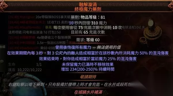 药剂&护符 ... 由于是走ES流派,生命药剂完全没用(青春永驻先不提药水那点回复能回多少,这大老远的怎么都点不过去吧),多连易燃和奉献蓝耗很高,如果正好和我一样手里有一瓶暗金蓝药,用起来肯定是比普通的蓝药舒服的,但算不上提升。