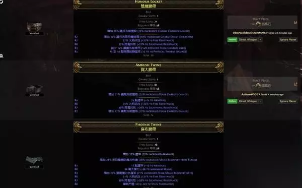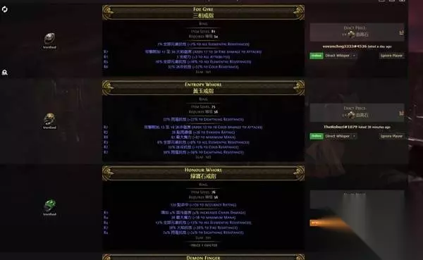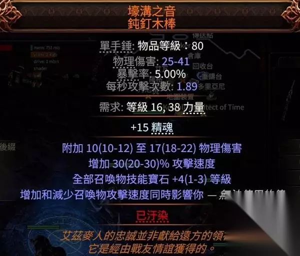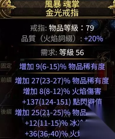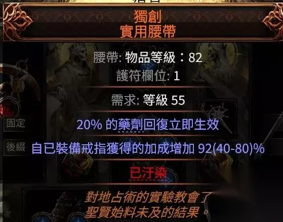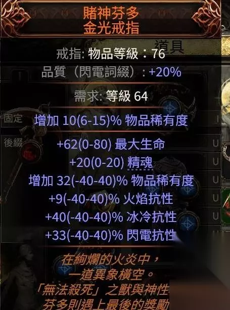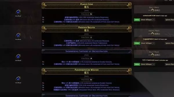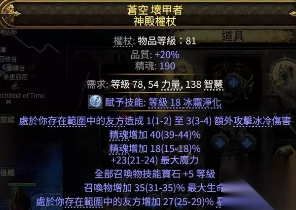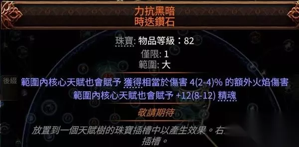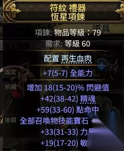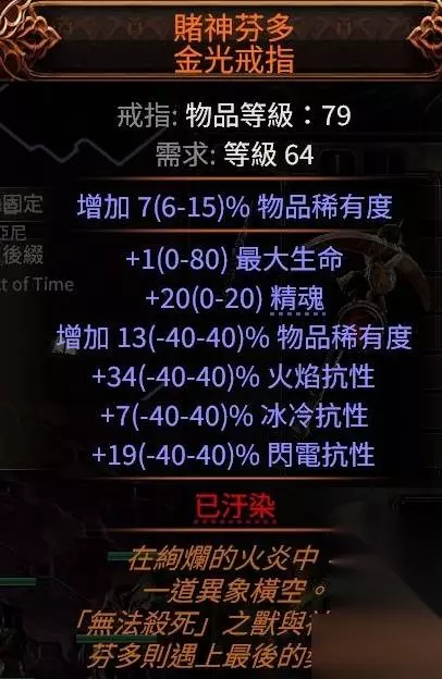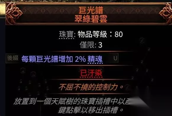 冷酷之宴有召唤物标签,可以吃到召唤物等级的加成,非古灵升华最高可以堆到39级3238的回盾,古灵则是40级3660,只要杀几只怪或者boss站死几个宝宝就能瞬间回满双倍es,在高压情况下对生存的提升极其明显,特别是在幻象异界(谵妄终局boss,15层迷雾)里,难1和难2基本可以做到站桩打完全程。 目前的价格大概是+2冷酷10d,+3冷酷20d,而20d你甚至买不到+1的纵火狂,相比之下可以说是性价比极高了。 提升精魂最明显的是力抗黑暗,带有加精魂词条的。我这颗是很早的时候8d买的,现在保守估计应该也有40d了?这个价格波动可能会比较大,加上不是很好搜,如果有需求就自己搜时价吧。因为价格超贵加上roll值范围小,可以不用太在意roll值买回来自己roll。