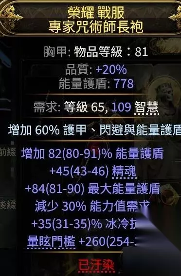 500ES+精魂+一点抗性的衣服,1E(实际上20%火抗那件打完符文已经能有600ES了) 不推荐100精魂的暗金衣服,理由和法器一样,都是拿3000以上的能量护盾换不到60的精魂。