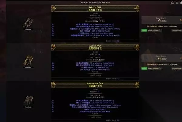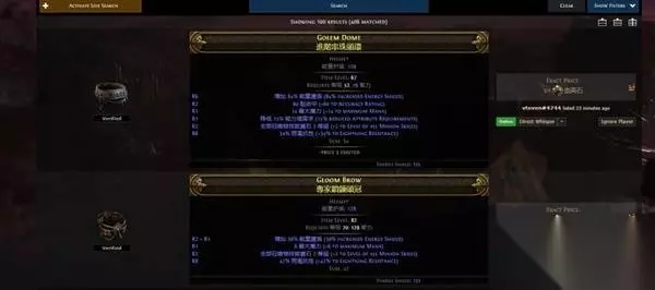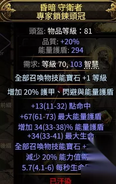 综上,我们只要花12E左右的价格就能买到一整套+2召唤等级、带精魂、30%移速、1200+ES(买回来之后自己打上符文)、补全抗性的护甲了,护甲上ES一般会被天赋点放大6倍以上,也就是实际能拥有7200以上的es,再配合法器的3000es,只要不超过15E的成本即可轻松拿到10000点的基础es,配合冷酷之宴翻倍,能把我们的一击线轻松堆到20000。 后续提升上,由于高抗性、20精魂、正稀有度(就算不堆也别弄成负数吧)的赌神基本是天价,所以应该尽量在护甲上分担抗性的压力。 头部应该追求瓦出+1召唤物等级词缀的高es头,精魂头如果遇到价格便宜的也可以过度,但是远不如+1等级。高es、抗性、+3的头也是天价,抗性就可以不考虑了。