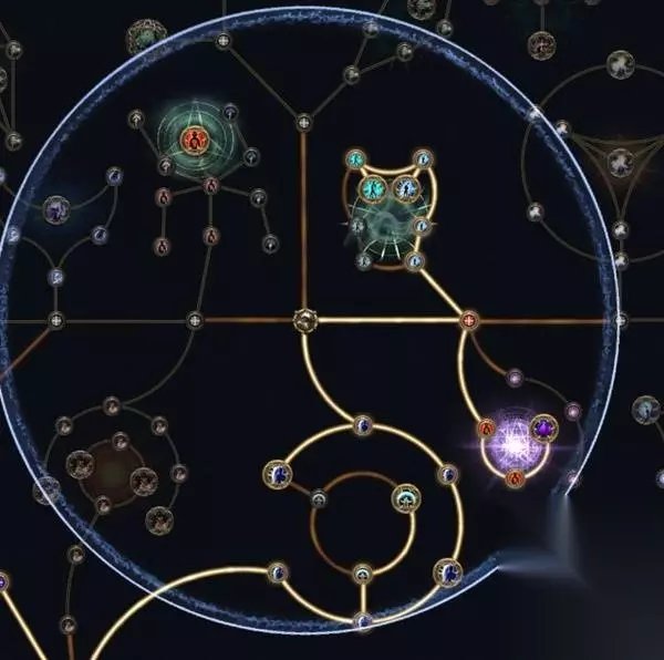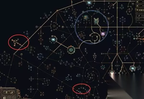 左侧两处较远的召唤物伤害圈分别是11点天赋=75%召唤伤+珠宝孔和7点天赋=45%召唤伤,因此二选一的情况下优先选择外圈的召唤伤,如果愿意放弃部分生存可以把内圈的45%也点上。顺带一提,剧痛奉献虽然有光环标签,但是吃不到光环效果,所以没有点出光环效果的必要。