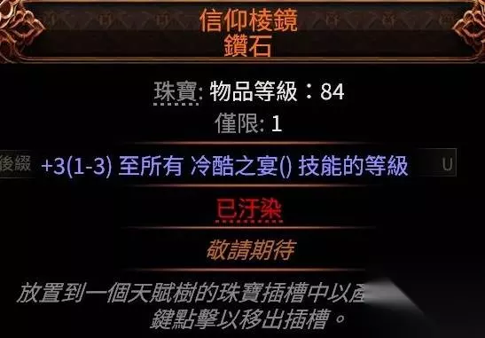 暗金珠宝重点推荐信仰棱镜,比较冷门(大概),但是提升极大。信仰棱镜可以给一个随机技能+1-3等级,掉落自带腐化没法d。目前+2纵火100d,+3纵火200d,有这笔钱我的建议是别玩召唤。因此可以买另一个等级提升效果极其明显的技能:冷酷之宴。