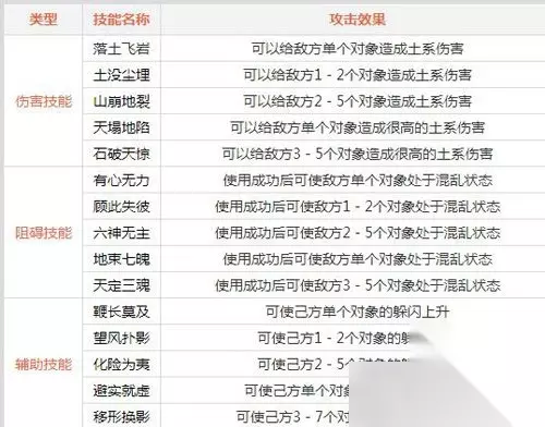 问道手游土系门派技能怎么样?土系门派厉害吗?很多玩家对这个职业还不是很了解,接下来就跟着小编一起来看下问道手游土系门派技能详细解析吧~一起走进这个擅长控制和加状态的门派! 土系主角善于用锤, 并精通使敌方混乱和提高己方躲闪能力的技能。 土相性的提升可以使人物物理攻击能力提升、物理攻击命中率提升、土系法术伤害提升、人物对土系法术的抗性提升。 技能效果说明 混乱:使被施用者处于混乱状态,处于混乱状态时该玩家所有战斗指令无效。有一定几率会物理攻击已方、有一定几率物理攻击对方(目标随机)。若无队友或宠物时,则较大几率物理攻击对方。 玩家等级到达10级以后,可以到门派拜师,并在本门童子处学习门派技能。 玩家等级到达60级以后,可以到本门师尊处拜师,并学习新的技能。 在童子处学习的技能是: 落土飞岩、土没尘埋、山崩地裂、有心无力、顾此失彼、六神无主、鞭长莫及、望风扑影、化险为夷。 在师尊处学习的技能是:天塌地陷、地束七魄、避实就虚、