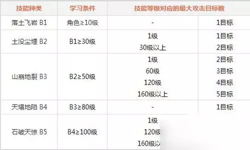 问道手游土系门派技能1 土系门派技能: 攻击类技能统称为B类技能,B1则代表第一个攻击类技能,B2代表高一级别的攻击类技能,以此类推。 障碍类技能统称为C类技能,C1则代表第一个障碍类技能,C2代表高一级别的障碍类技能,以此类推。 辅助类技能统称为D类技能,D1则代表第一个辅助类技能,D2代表高一级别的辅助类技能,以此类推。 技能等级相关: 随着技能等级的提高,技能的效果和每次使用时所能作用的目标数将会增加。 随着低阶技能等级的提高,同类型高阶技能的法力消耗将减少。 所有技能的等级只能≤人物等级*1.6。 攻击类技能: