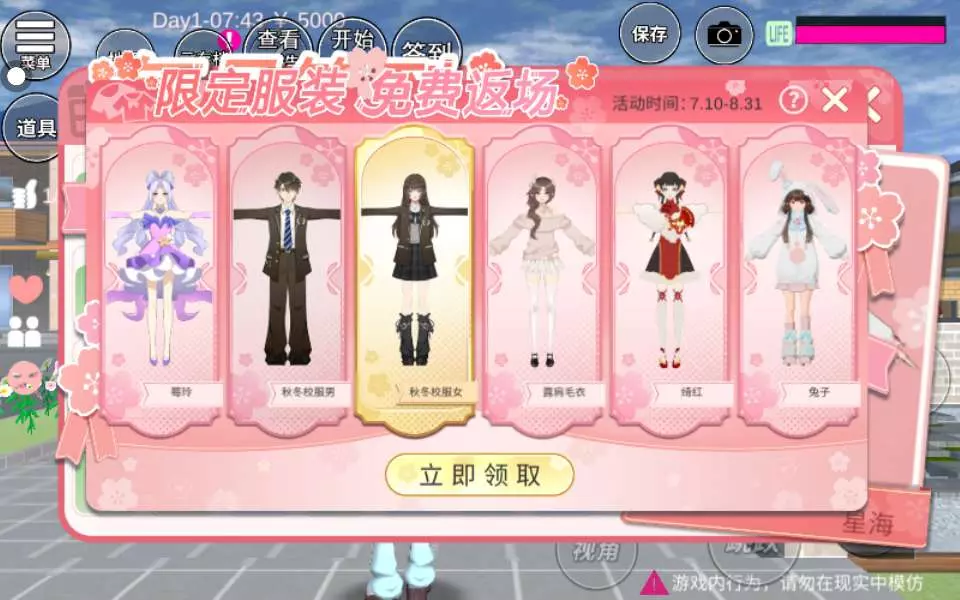 限定服装,免费返场。活动时间7月10日~8月31日 领取方法上线并进入游戏