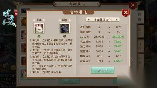 问道宠物怎么进化魂魄 宠物进化魂魄的方法有两种:自然进化和使用进化卷轴。自然进化是指宠物在战斗中获得经验,达到一定等级后会自动进化。具体来说,当宠物达到等级上限时,会触发一次自然进化。 宠物进化魂魄是通过宠物进阶系统实现的。在宠物进阶界面中,你可以选择需要进阶的宠物和进阶需要的魂魄数量。魂魄可以通过多种途径获得,包括完成副本、活动、购买等。 然后根据查询结果去练功区捕捉相应的宠物宝宝,回到达闻散人处后,便可将对应的宠物进行进化,进化时,需要花费一定数量的元宝。进化成功后,副宠的魂魄便附着到主宠身上,主宠的基础成长被副宠的基础成长所覆盖。 根据查询结果去天上集市或者商会购买相应的副宠,或者到练功区抓获用归元洗,回到达闻散人处后,便可将对应的宠物进行进化,进化时,需要花费一定数量的元宝。 宠物进化后就会获得魂魄,进化主宠不变进化副宠变成魂魄,进化后主宠的所有成长变成副宠的成长,进化只需要副宠和元宝,不需要其它材料。玩家可以通过宠物进化来组合宠物的技能和成长,以打造自己个性化的宠物。 金头陀需要到70级才有承载云兽魂魄的能力。因为云兽的携带等级是70 另外,进化用的副宠必须是宠物宝宝才行。进化不可以直接从金头陀-云兽。 问道手游宠物怎么升级快?弄强大?附培养方法 1、强化需要消耗宠物强化丹,宠物强化丹可在游戏中的商城里进行购买,每次强化需要一颗宠物强化丹。需要注意的是,如果使用的宠物强化丹是限制道具,那么强化后的宠物将会在一段时间内限制交易哦。 2、问道宠物培养方法一览:尽量将道具留给高级宠,如归元露、宠物强化丹、超级晶石、超级灵石,归元露与宠物强化丹可以在月签到中获取,不要浪费在低级宠物上,尽量留着用在电精、云兽、雷怪上面才算物有所值。 3、经验丹,对于宠物升级有极大的帮助,而且经验丹的经验也是随宠物等级提升而提升的,给宠物喂食大量的经验丹就可以快速提升宠物的等级了。宠物经验丹获取 集市购买 放生宠物 竞技场兑换。 4、首先,要让宠物获得经验值,最直接的方法是进行战斗。你可以选择与强大的对手战斗,因为战斗胜利所得到的经验值更多。 5、首先问道宝宝可以通过巡逻升级。然后问道宠物也可以通过日常升级。3 最后如果资金足够多可以使用宠物经验丹进行升级。 6、宠物快速升级的方法有以下几种:通过完成任务获得经验值在游戏中,许多任务都会奖励经验值,通过完成这些任务可以快速提升宠物等级。建议优先完成主线任务和日常任务,以及一些带有经验加成的特殊任务。 问道手游宝宝强化进阶攻略大全详尽解析 1、强化属性:在问道手游中,宠物进化后,主宠的强化等级不变以及强化效果是不变的,都是按照主宠的成长计算。进化后的宠物依然可以进行强化操作,不过强化增加的属性,都是按照主宠的成长来计算的。 2、在游戏面板的右上方点击宠物头像便会跳出一个宠物属性界面,在界面下方有一个强化按钮。点击强化按钮就会跳出强化界面。 3、进化方法:玩家可以在天墉城(120,169)的达闻散人处查询自己身上的宠物可以进化为哪些宠物。然后根据查询结果去练功区捕捉相应的宠物宝宝,回到达闻散人处后,便可将对应的宠物进行进化,进化时,需要花费一定数量的元宝。 4、首先各位需要准备一只主宠和一只副宠 前往问道手游天墉城npc:(达闻散人)进行进化操作。副宠查询:可以到天墉城npc(达闻散人)处查 询自己身上的宠物可以进化为哪些宠物。 5、道友们可在商城购买宠物强化丹。宠物进化:首先各位需要准备一只主宠和一只副宠前往问道手游天墉城npc:(达闻散人)进行进化操作,同时达闻散人也查询自己身上的宠物可以进化为哪些宠物。 问道手游宠物怎么进化 问道手游中,宠物进化当然没有这么繁琐,玩友们直接进入宠物界面,点击需要进化的宠物进行进化就可以了,当然问道手游中宠物进化也是有消耗的。 然后根据查询结果去练功区捕捉相应的宠物宝宝,回到达闻散人处后,便可将对应的宠物进行进化,进化时,需要花费一定数量的元宝。 进化成功后,副宠的魂魄便附着到主宠身上,主宠的基础成长被副宠的基础成长所覆盖。 在问道手游中,宠物进化后,主宠的强化等级不变以及强化效果是不变的,都是按照主宠的成长计算。进化后的宠物依然可以进行强化操作,不过强化增加的属性,都是按照主宠的成长来计算的。 强化除后缀为 元灵、神兽、变异或野生的宠物外,其他宠物都可以进行强化。 宠物强化规则方式调整后,进化、羽化、幻化后的宠物也可以进行强化操作来提升宠物的能力。