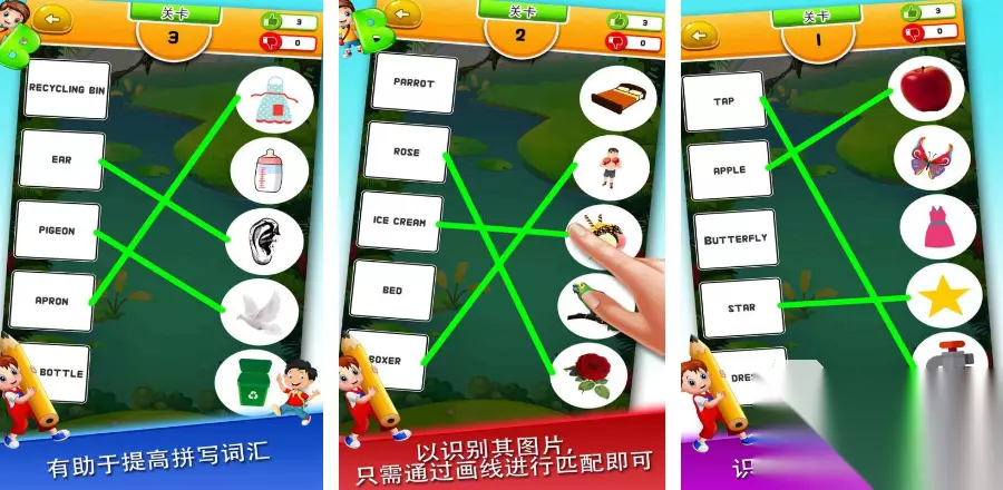 这款连线挑战手游对玩家的思维发展有益,玩家需将英文单词与相应图片配对连接,以便顺利通过关卡。这种独特的英文挑战模式,能增强孩子的记忆能力,在不知不觉中扩大孩子的词汇量。游戏的关卡设计丰富多样,没那么容易产生无聊感,极具重复游玩价值,深受众多玩家的喜爱与认可。 高速下载 普通下载 优先233乐园APP下载 3、《开心水果连连看》