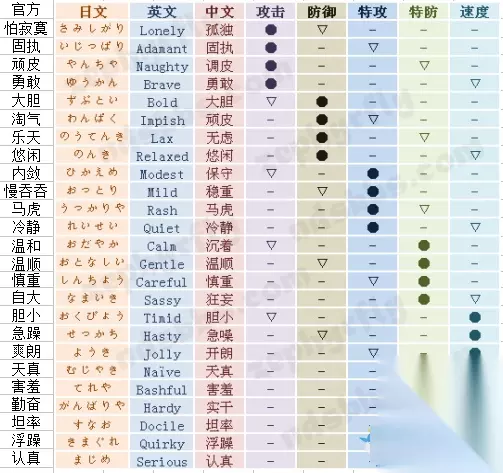 《口袋妖怪:太阳/月亮》中性格会影响精灵的属性值,但是官方性格表是日文的很多玩家看不懂,今天小编就为大家带来口袋妖怪太阳月亮中文性格对照表,告诉各位口袋妖怪日月性格修正表一览,感兴趣的一起来看看吧。 口袋妖怪日月性格修正表一览: 官方性格翻译表