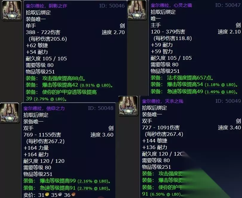 剑柄任务奖励为奎尔塞拉的姐妹剑奎尔德拉,251物品等级属性4选1。对于无法使用剑类武器的职业则有同属性的单双手锤作为替换品,可以涵盖全职业全天赋。251物品等级已经达到了10人普通冰冠堡垒掉落装等,对于还拿着226等级武器的国服玩家来说那真是鸟枪换炮,小编预测国服若在P4阶段重开。
