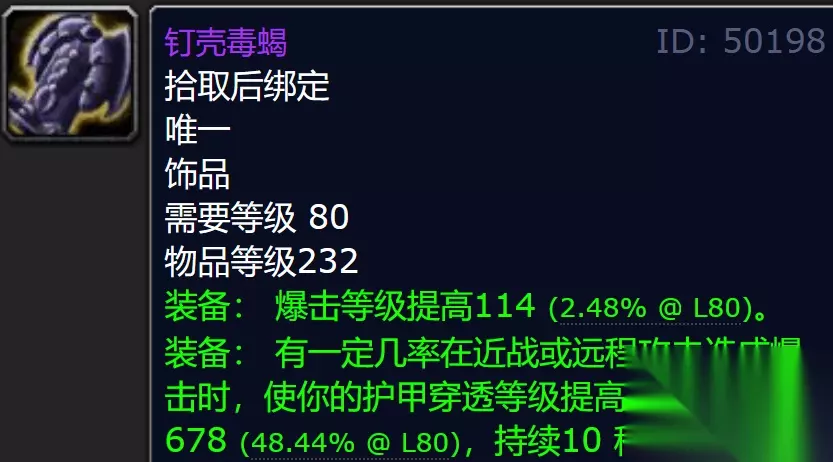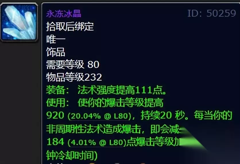 英雄萨隆矿坑3号BOSS掉落的永冻冰晶的特效非常独特,是80级唯一一个特效为提高爆击等级的法系饰品,恰好痛苦术的核心输出DOT技能腐蚀术享受爆击快照,因此永冻冰晶就成为了痛苦术卡高爆击腐蚀术的黑科技饰品,虽然不足以与ICC的那些极品饰品分庭抗礼,但是对于装备尚处于NAXX阶段的国服玩家来说算得上是必刷神器了。