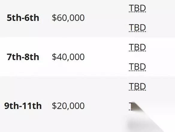 第5-6名:$60,000 第7-8名:$40,000 第9-11名:$20,000