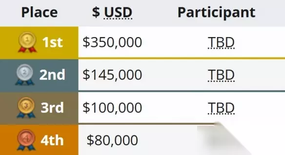 五:赛事奖金池:总奖金高达100万美元 冠军:$350,000 亚军:$145,000 季军:$100,000 殿军:$80,000