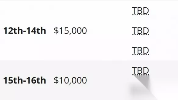 第12-14名:$15,000 第15-16名:$10,000