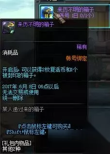 DNF来历不明的箱子能开什么奖励详解,神秘人已经出现,那么来历不明的箱子中能开出什么东西呢?想知道的小伙伴请继续往下看。 购买来历不明的箱子之后打开就可以获得2个复活币和一个被封印的礼盒,那么被封印的礼盒中又能开出什么东西?