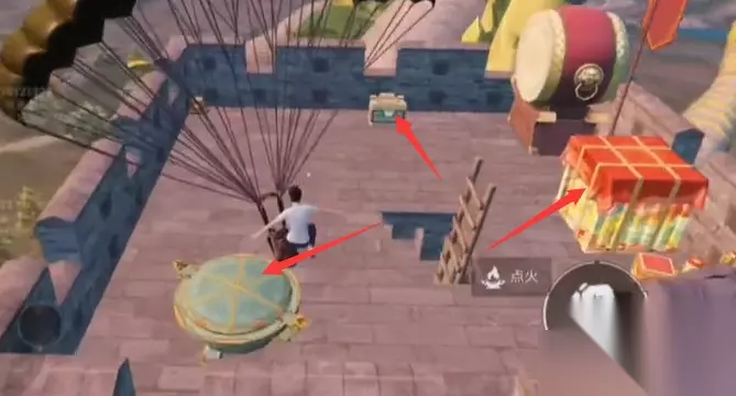 2、然后找到箱子、空投点击拾取,拿到加特林对着如下图箭头所示的物品点火;