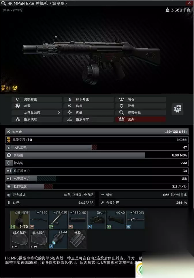 关键字提取:一把mp5冲锋枪、50发的扩容弹匣、需要消音器、需要战术灯、需要瞄具、有效射程大于200米、人机工效大于45。 关键字提取:一把mp5冲锋枪、50发的扩容弹匣、需要消音器、需要战术灯、需要瞄具、有效射程大于200米、人机工效大于45,特别注意:这次枪匠任务需要把mp5的机匣换成mp5sd的机匣。
