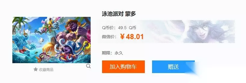 《英雄联盟》泳池派对蒙多皮肤售价49.5Q币,微信支付为48.01元,玩家可在游戏商城或官网道聚城搜索该皮肤,选择直接购买或加入购物车结算的方式获取。
