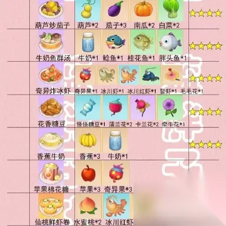 4、水煮大闸蟹 主料:大闸蟹*1 配料:毛毛花*1、白菜*1 5、花椒狗鱼片 主料:狗鱼*1 配料:白菜*2、茄子*4 6、弹跳甲鱼汤 主料:甲鱼*1 配料:南瓜*2、胡萝卜*3 7、玉米浓汤 主料:玉米*1 配料:胡萝卜*2、鸡蛋*2 8、棉花糖豆浆 主料:棉花糖*2 配料:小麦*3、玉米*2、胡萝卜*3 9、香煎雪鱼 主料:雪鱼*1 配料:胡萝卜*3、红色浆果*2