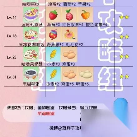 10、葫芦炒茄子 主料:葫芦*3 配料:茄子*5、南瓜*2、白菜*2 11、小麦牛奶蛋粥 主料:小麦*2 配料:小麦*1、牛奶*1、鸡蛋*2、鸭蛋*1 12、清炒毛毛豆 主料:毛毛豆*1 配料:奇异果*2、葫芦*4 总而言之,截止二测一共有十二道料理,所需的材料这里也是详尽地列出了,后续更新菜谱的时候这里也会第一时间更新的。 摩尔庄园手游新手攻略推荐 摩尔庄园下载版本推荐