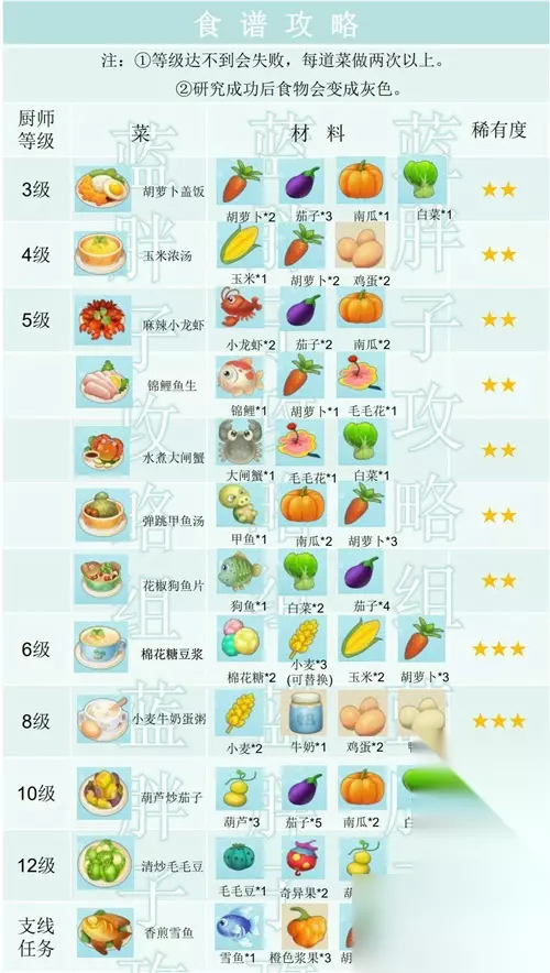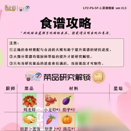 二、文字版 1、麻辣小龙虾 主料:小龙虾*2 配料:茄子*2、南瓜*2 2、胡萝卜盖饭 主料:胡萝卜*2 配料:茄子*3、南瓜*1、白菜*1 3、锦鲤鱼生 主料:锦鲤*1 配料:胡萝卜*1、毛毛花*1