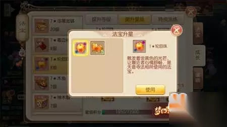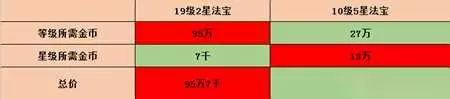 接着在给法宝提升星级时玩家就不要在傻傻的喂低星材料了!可以很负责的告诉各位这纯属浪费材料:不同星级法宝提供的积分存在着成倍的差距,一星100点、二星300点、三星900点、四星2700点;这里我们以提升五星法宝为例,通过喂养一星法宝我们需要消耗27个,而在商会中一星法宝的售价为2000金币,换算而来的话就是要消耗五万四的金币;如果我们用同级喂养的方式先获得一个四星法宝,那么仅需要8个一星法宝,期间通过提升法宝星级需要耗费五个左右的聚星丹,经过核算将消耗掉四万一的金币,自然随着提升星级的上升两种方法间的优劣性也会越来越大。