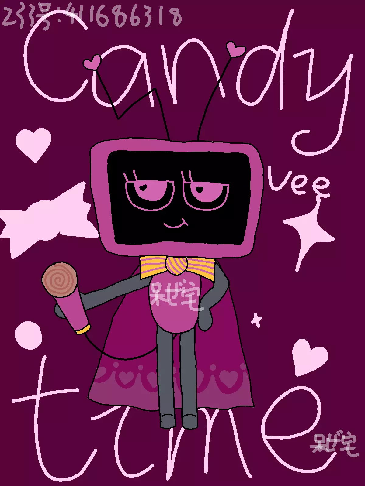 糖果时间,有很多糖果和少女心的元素,我选择了我最喜欢的vee,我把vee的天线改成了爱心,胸前的蝴蝶结改成了糖果(可能不明显),把尾巴后面的麦克风改成了棒棒糖,添加了类似星空时装的披风,最后就是把vee的颜色改了一下(原创勿盗,可以选择其他角色绘制)