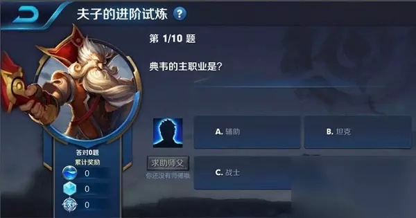 进阶试炼 1、进阶的试炼并不是一个任务,相当于是一个成就,只能做一次。 2、我们可以进入角色的王者生涯,在这里就能看到夫子的进阶试炼选项,点击开始答题就能开启。
