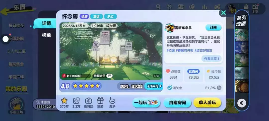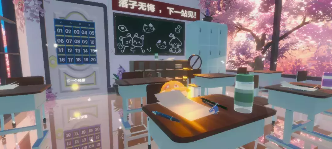 整体场景非常的美丽,教室外是樱花树,刚好有一束光线洒在小蛋仔身上,打卡完后即可到后边去下一个场景啦(ง •̀灬•́)ง🌱